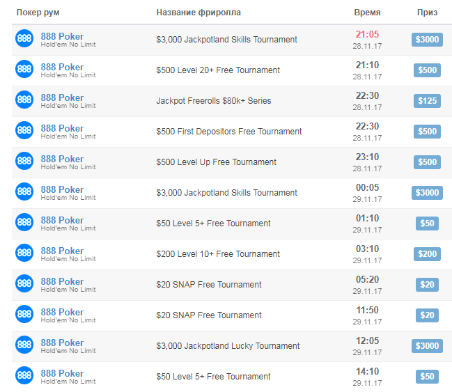 888Poker. Среди покер румов с фрироллами без депозита следует отметить 888Покер, занимающего почетное второе место в рейтингах на протяжении последних лет. Рум предлагает своим новым клиентам бездепозитный бонус, основная часть которого состоит из турнирных билетов. Используя их, покеристы имеют возможность начать строить свой игровой банкролл.