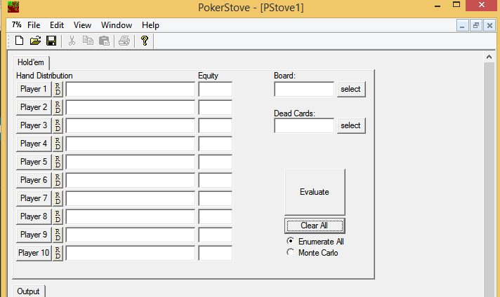Несмотря на то, что покерный калькулятор PokerStove на русском скачать бесплатно не получится ввиду отсутствия русского интерфейса, его использование не станет проблематичным. Совершив установку и активацию приложения, пользователь увидит основное окно программы, где есть поля для введения данных о картах или спектре рук игроков.